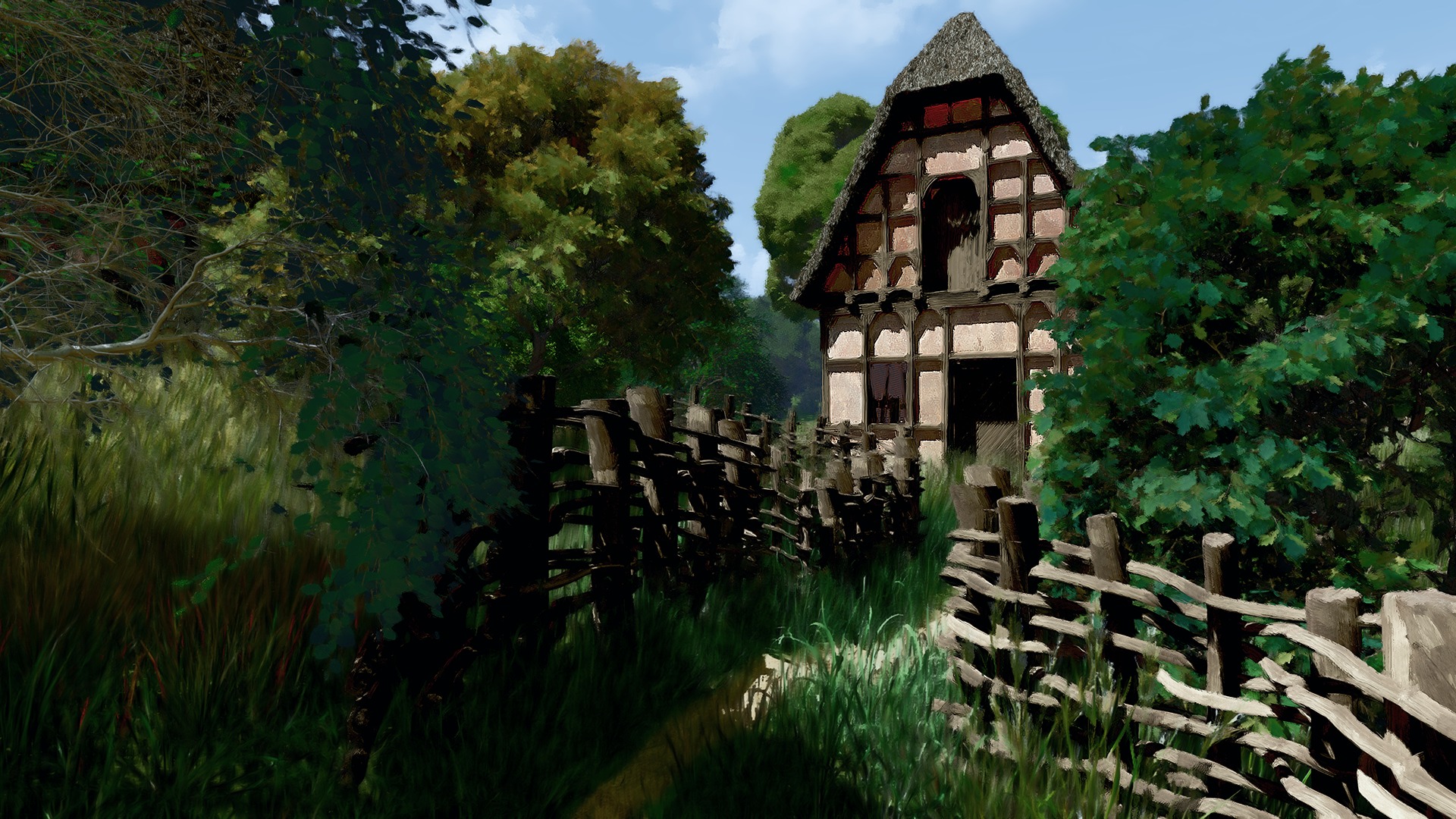 Fachwerk homes, fences, and meadows in a painterly medieval landscape.